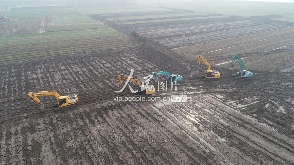 2019年2月20日,江苏省灌云县图河镇高标准农田建设项目区,机械在现场施工。(无人机拍摄)