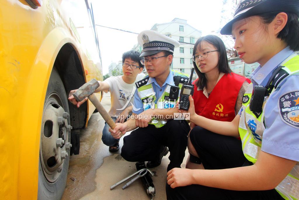 交警和党员干部正在当地蓝天学校对校车进行安全隐患检查。