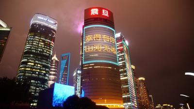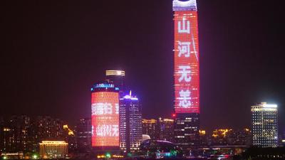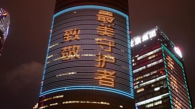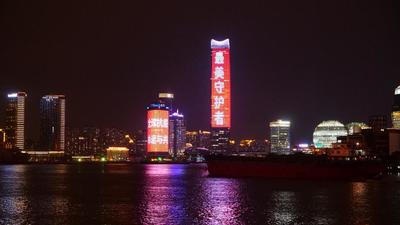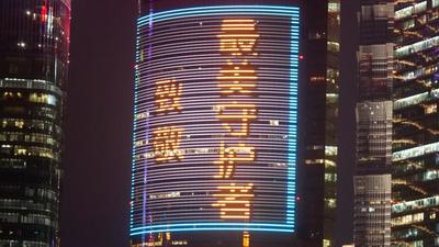 2020年3月31日晚8点至9点,上海黄浦江两岸地标建筑、各区主要商圈大屏、外墙和出租车等全市公益广告阵地统一亮屏亮灯、集中刊播海报,向医护人员致敬。