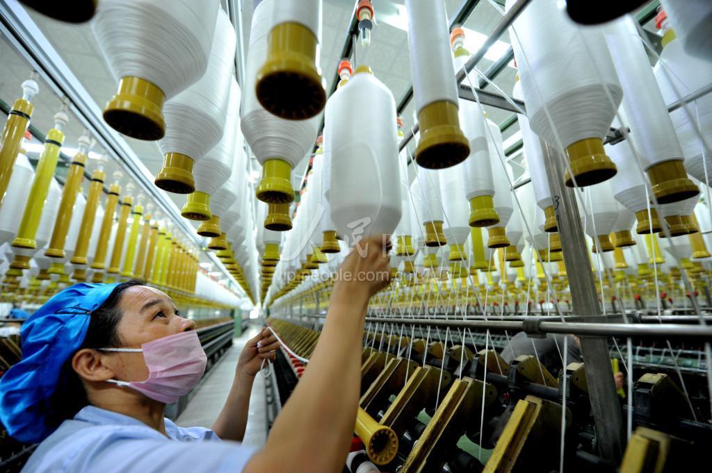 2020年4月12日,江西省玉山县纺织女工正在加紧纺织出口欧美的涤纶纱线。