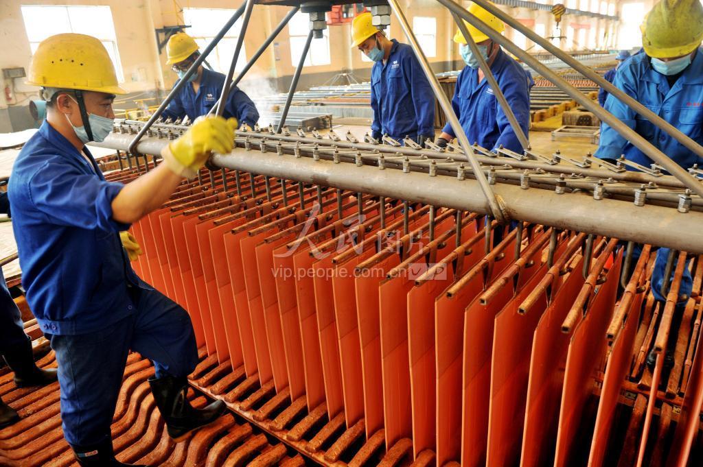 2020年4月13日,江西省上饶市横峰县经济开发区一环保科技企业员工正在提炼萃取的电解铜。 据了解,该企业是一家以再生资源回收、有色金属加工、工业废物的处置及综合利用等技术生产阳极铜、电解铜的民营企业,可年产10万吨阳级铜和10万吨电解铜,不仅可以从中获得年产近20亿元的经济效益,上缴利税1.27亿元,还能使原本废弃的隐形金属得到充分利用,同时让当地近500人农民工在家门口实现就业。