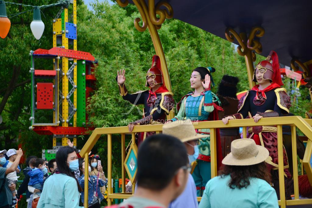 2020年5月14日,小型的花车巡游,朱迪警官、爱莎公主、花木兰等迪士尼经典角色均“拼”在一辆车上,向游客问好。