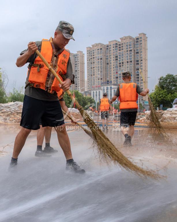 2020年7月16日,江西庐山市南康堤,子弟兵们一边抗洪抢险一边抓紧对退水地段进行清淤,保护人民群众生命健康。