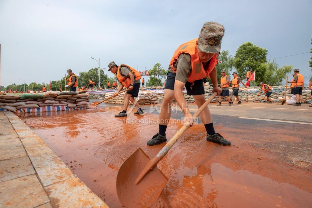 2020年7月16日,江西庐山市南康堤,子弟兵们一边抗洪抢险一边抓紧对退水地段进行清淤,保护人民群众生命健康。