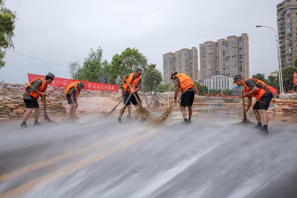 2020年7月16日,江西庐山市南康堤,子弟兵们一边抗洪抢险一边抓紧对退水地段进行清淤,保护人民群众生命健康。