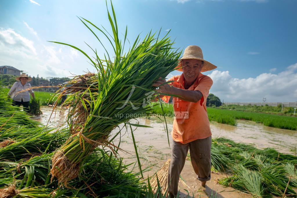 7月28日,江西鄱阳湖畔的庐山市星子镇胜利村农民正在起晚稻秧苗。