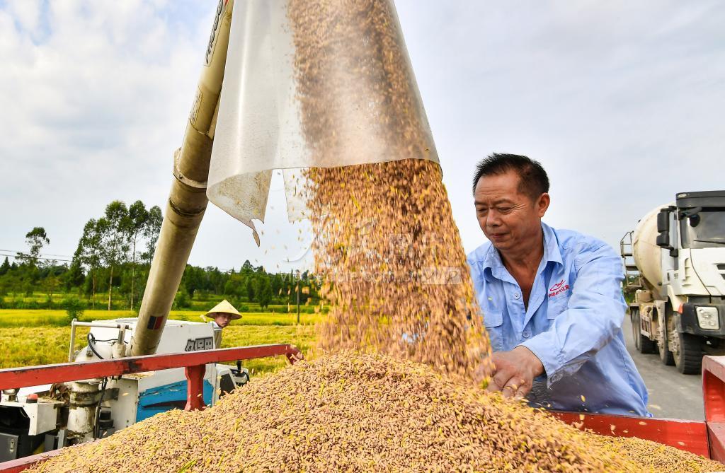 2020年8月15日,四川省广安市广安区花桥镇农民在田间地头装运刚收割的水稻。