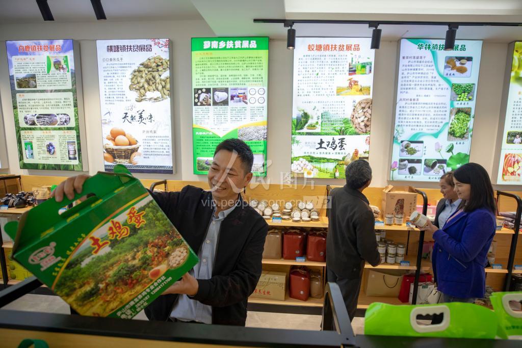 2020年10月16日,江西省庐山市消费扶贫生活馆正式运营,消费者正在选购农副产品。