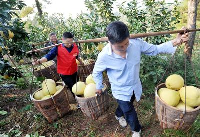 2020年11月7日,江西省上饶市广丰区嵩峰乡党员干部协助村民将订单马家柚挑回家。