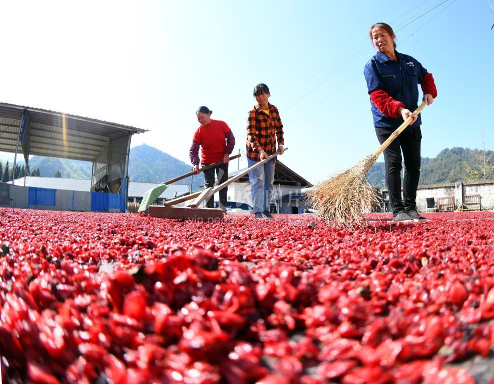 2020年11月10日,浙江省杭州市淳安县临岐镇梅口村,村民正在利用晴好天气晾晒刚刚采摘的山茱萸。 近年来,淳安县立足资源优势,深入实施“康美千岛湖”战略,大力发展中药材种植,全县中药材种植面积达12万亩,其中山茱萸种植面积有2万余亩。通过建设中药材市场,培育中药材新业态,有效促进了农民持续增收。