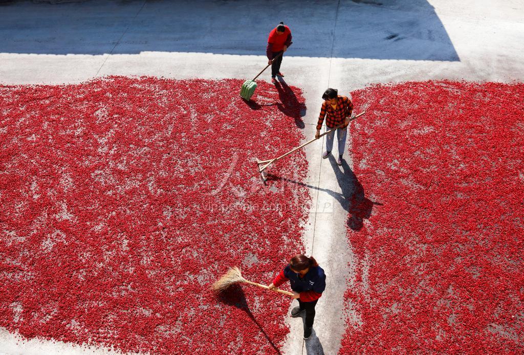 2020年11月10日,浙江省杭州市淳安县临岐镇梅口村,村民正在利用晴好天气晾晒刚刚采摘的山茱萸。 近年来,淳安县立足资源优势,深入实施“康美千岛湖”战略,大力发展中药材种植,全县中药材种植面积达12万亩,其中山茱萸种植面积有2万余亩。通过建设中药材市场,培育中药材新业态,有效促进了农民持续增收。