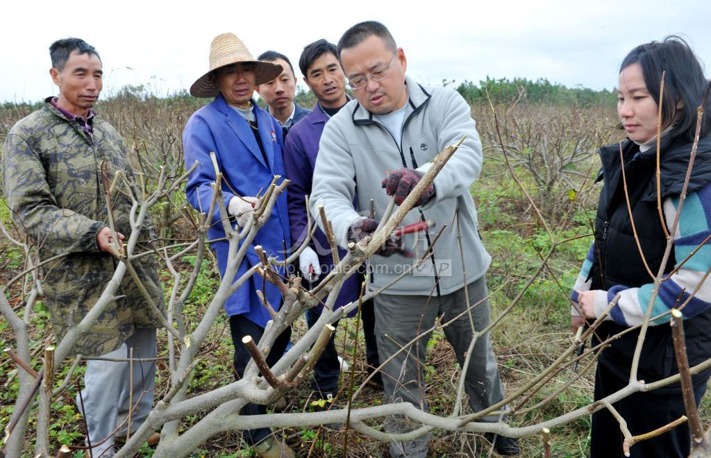 2020年11月22日,江西省鄱阳县“草根人才”、海归高材生佘贻谋(右二)正在现场指导农民做好冬季中药材枝叶修剪和管理。