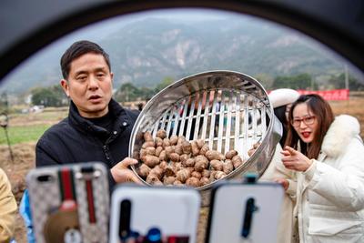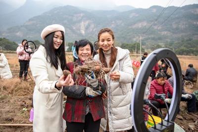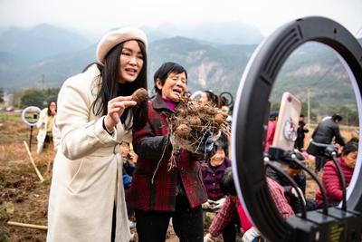 2020年12月7日,江西省庐山市白鹿镇万杉村产业扶贫基地,网络主播在田间现场直播推介当地特色毛芋,为扶贫产品带货。 庐山市不断完善产业扶贫利益联接机制,积极开展电商扶贫,开展直播培训,壮大电商销售人才队伍,拓宽扶贫产业销售渠道,使扶贫产业稳定发展。