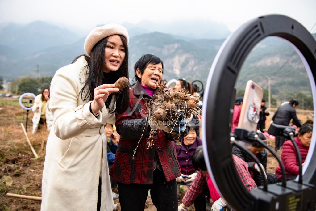 2020年12月7日,江西省庐山市白鹿镇万杉村产业扶贫基地,网络主播在田间现场直播推介当地特色毛芋,为扶贫产品带货。 庐山市不断完善产业扶贫利益联接机制,积极开展电商扶贫,开展直播培训,壮大电商销售人才队伍,拓宽扶贫产业销售渠道,使扶贫产业稳定发展。
