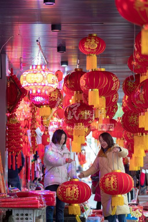 1月30日,随着农历新年的的临近,江西庐山市火红的灯笼、金黄的福字挂满了市场,市民们开始采购年货。
