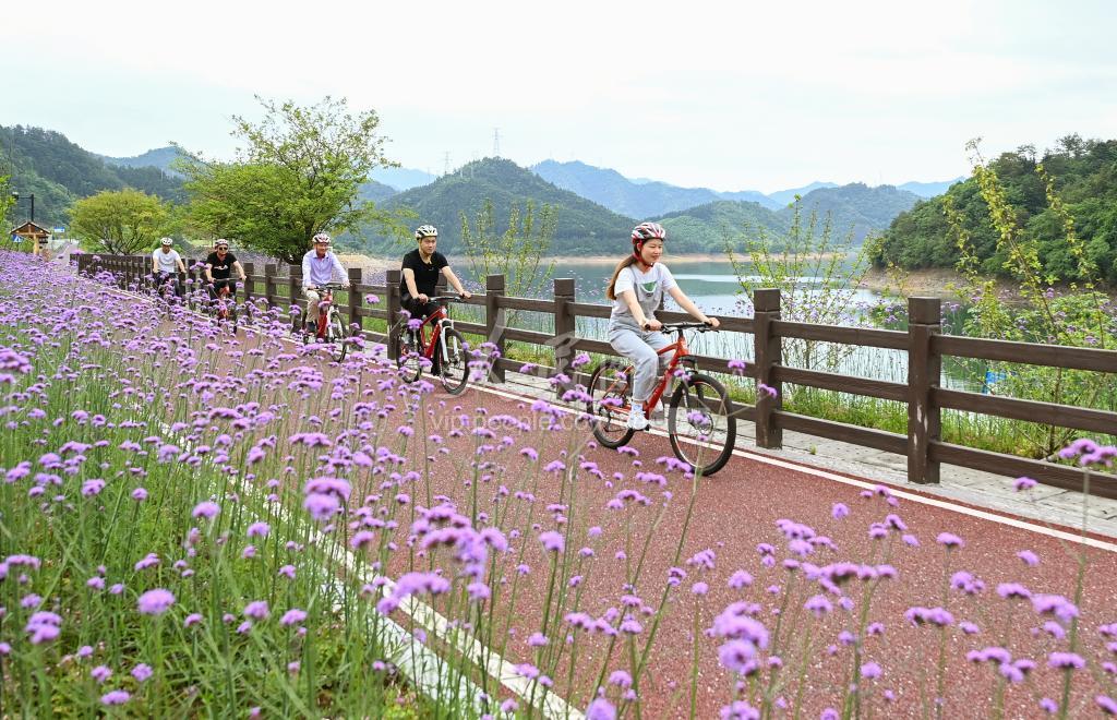 2021年5月12日,浙江省杭州市淳安县文昌镇千岛湖畔,游客在骑行绿道花海中慢赏风景,放松心情,感受千岛湖的秀美风光。