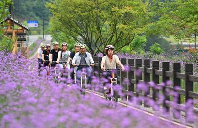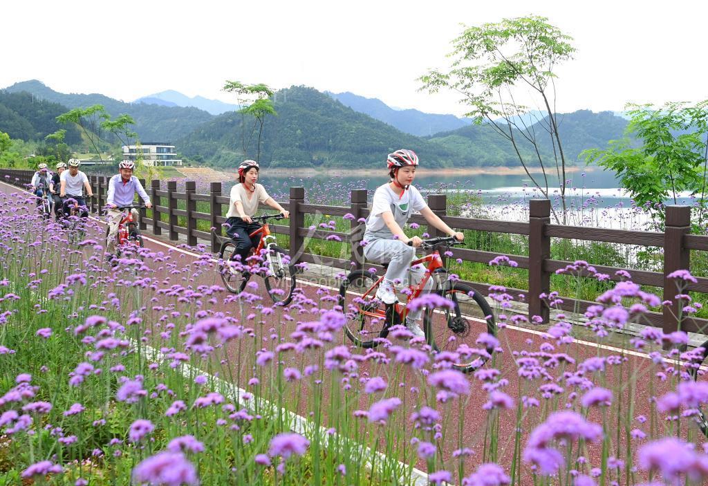 2021年5月12日,浙江省杭州市淳安县文昌镇千岛湖畔,游客在骑行绿道花海中慢赏风景,放松心情,感受千岛湖的秀美风光。