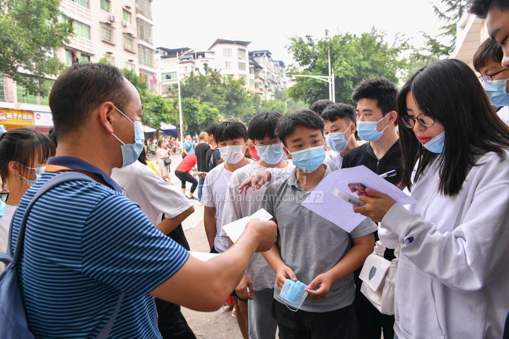 2021年6月7日,在四川广安二中考场外,带队老师为考生统一发放身份证和准考证。
