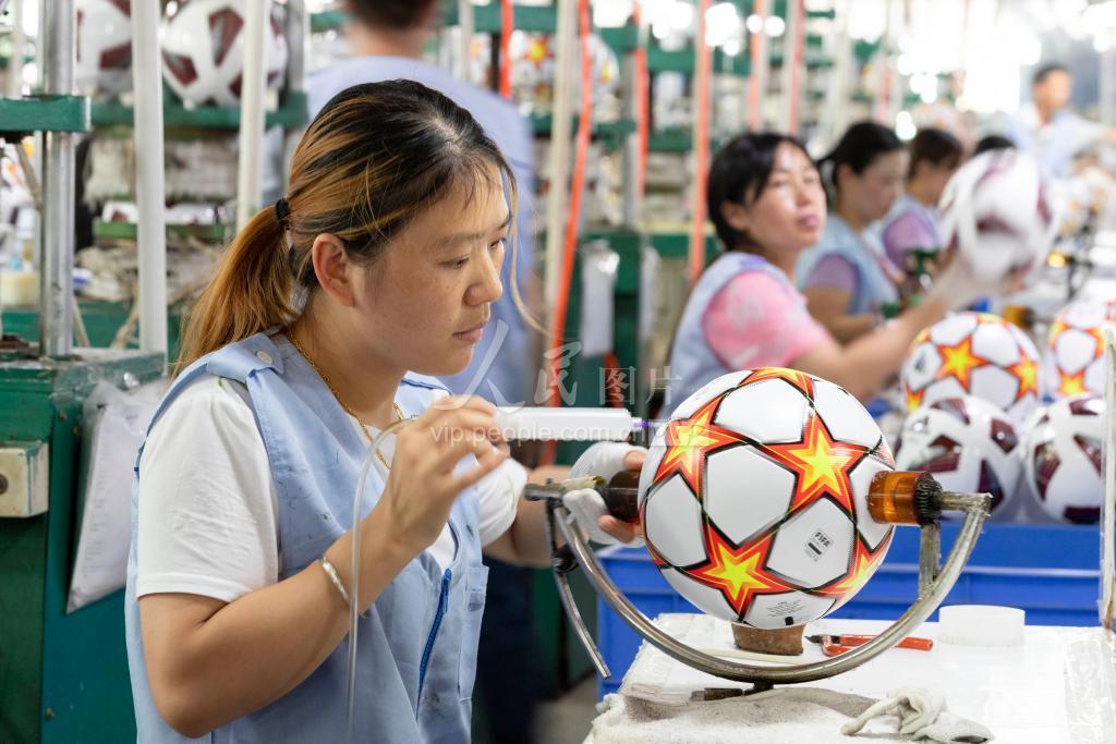 2021年6月22日,江西庐山市九江思麦博运动器材有限公司的生产车间,工人们正忙着生产出口订单。从2008年投产以来,该企业已连续生产三届世界杯和欧洲杯指定用球。