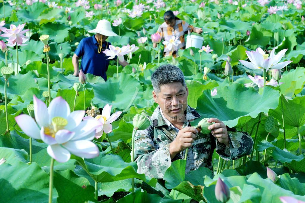 2021年7月10日,江西省广昌县驿前镇姚西村莲农正在莲田里采摘成熟的莲蓬。 时下正是白莲采摘时节,素有“中国白莲之乡”美誉的江西广昌县莲田里随处可见莲农采收白莲的场景。近年来,该县将白莲产业列为巩固脱贫攻坚成果和推进乡村振兴的农业特色主导产业,积极加大科技创新力度,推行广昌白莲绿色标准化栽培管理技术,有效提升了莲农科学种莲水平和产业增收能力,今年全县种莲面积达11万余亩,并成为当地莲农增收致富的主要经济来源。