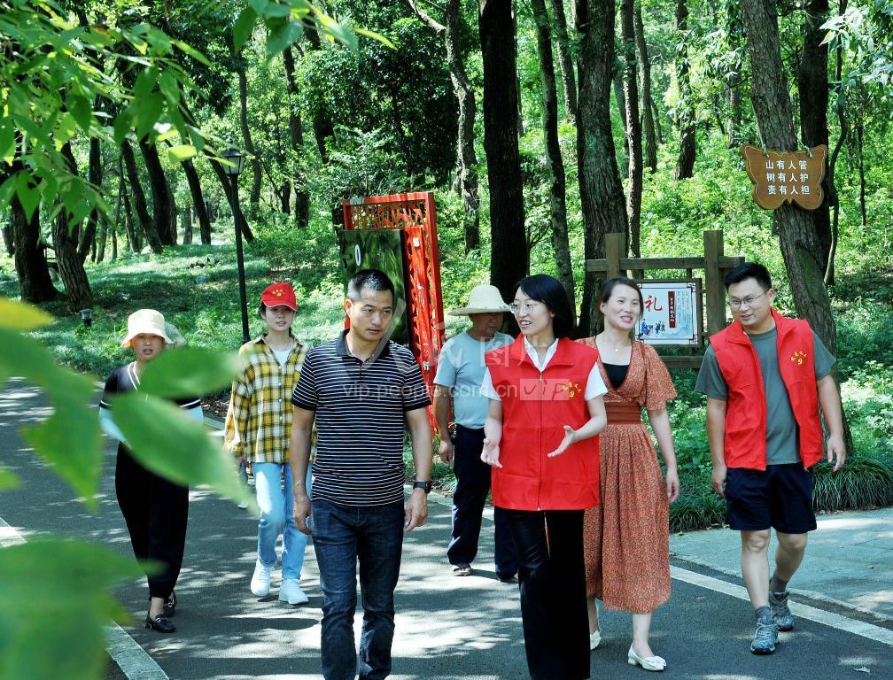 2021年8月7日,江西省德兴市香屯街道办党员干部正在当地汪家村了解该村森林公园建设情况和游客的人流量。
