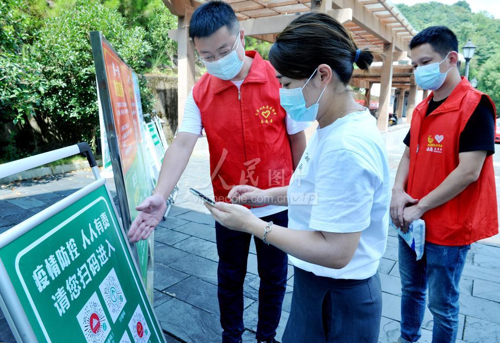 2021年8月8日,江西省德兴市大茅山风景名胜区党员干部正在景区入口指导游客扫码进入景区。