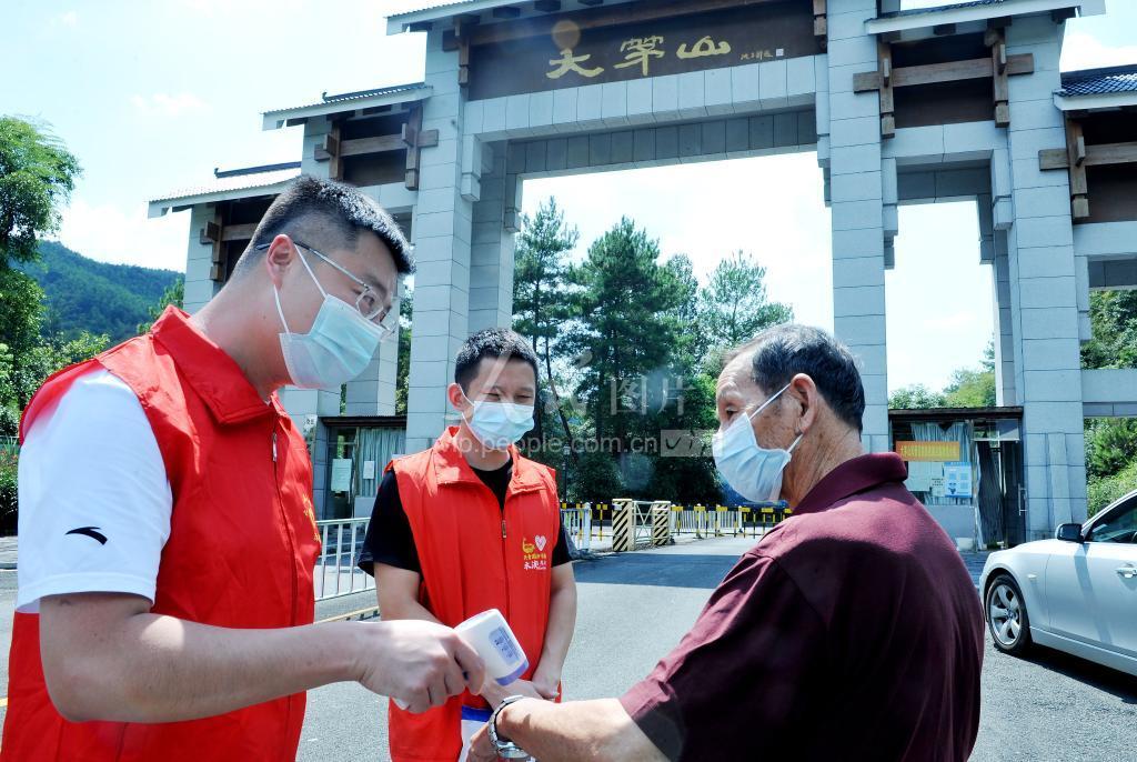 2021年8月8日,江西省德兴市大茅山风景名胜区党员干部正在景区入口,协助检票员做好游客进入景区前的防疫体温检测。