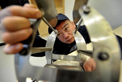 2022年1月16日,中国铁路南昌局集团公司鹰潭机务段整备车间交车工长聂华平正在研究和谐型机车制动夹钳杠杠螺栓不折解双晶探伤工艺改进方法。