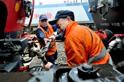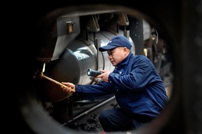 2022年1月16日,中国铁路南昌局集团公司鹰潭机务段整备车间交车工长聂华平正在对今年春运火车机头做出发前的最后检查。 据了解,聂华平是鹰潭机务段一名专修火车头的机车钳工,20多年的工作经验让他练就一手过硬的技术本领,并总结出一套“听、看、闻、摸”工作法,期间共发现处理机车重大故障437件,排除安全隐患问题2700余件。他本人先后被授予集团公司首席技师、“火车头”奖章和江西省劳动模范殊荣,被工友们称之为专修火车头的“铁头大夫”。