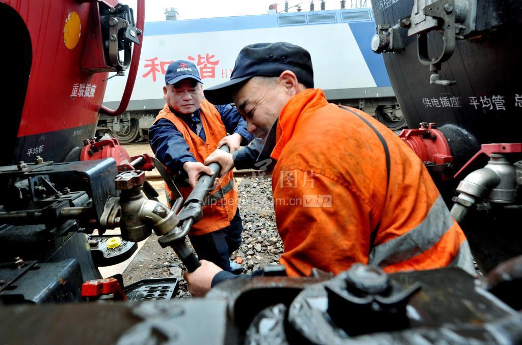 2022年1月16日,中国铁路南昌局集团公司鹰潭机务段整备车间交车工长聂华平(左)与工友一起更换机车风管。