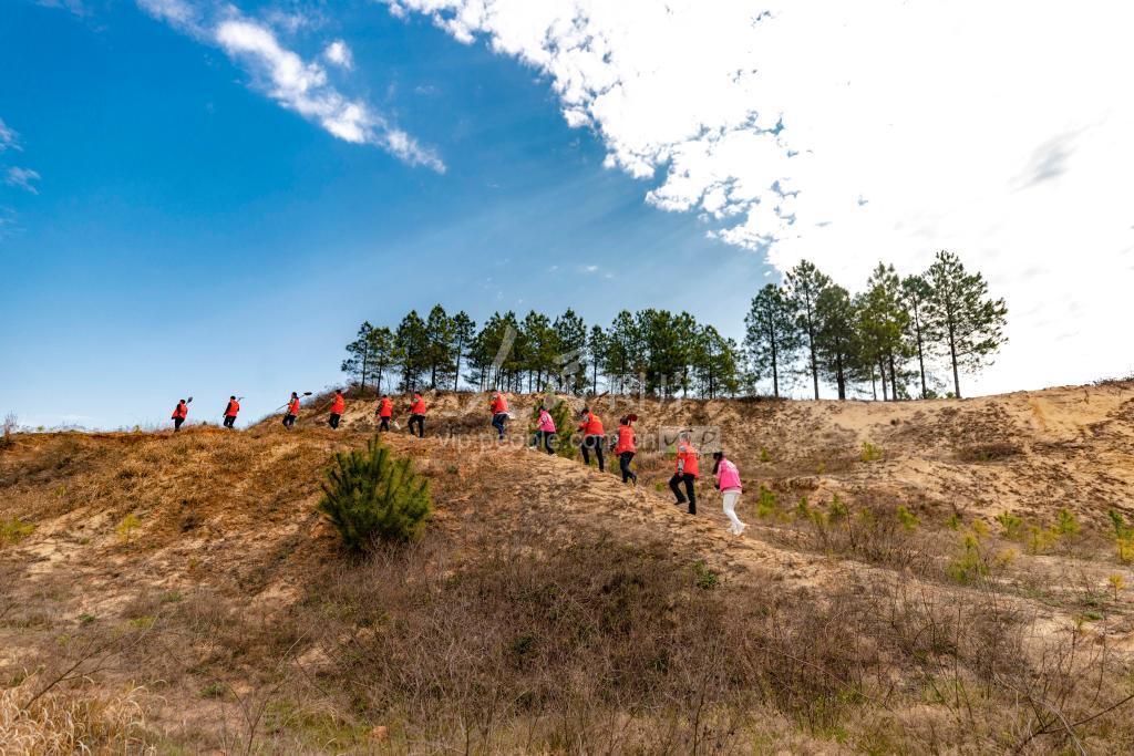 2022年3月10日,江西庐山市蓼南乡,乡村干部参加新时代文明实践义务植树活动,在鄱阳湖区下洋澜沙漠种植湿地松。 庐山市积极践行“两山”理念,发展生态文明,推动绿色发展,动员党员干部、新时代文明实践志愿者、群团组织经常性开展植树造林,同时落实林长制,使生态环境持续向好。