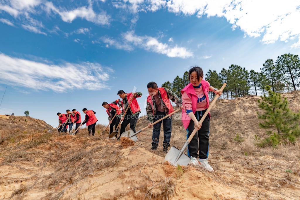 2022年3月10日,江西庐山市蓼南乡,乡村干部参加新时代文明实践义务植树活动,在鄱阳湖区下洋澜沙漠种植湿地松。 庐山市积极践行“两山”理念,发展生态文明,推动绿色发展,动员党员干部、新时代文明实践志愿者、群团组织经常性开展植树造林,同时落实林长制,使生态环境持续向好。