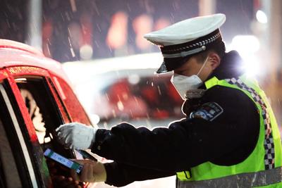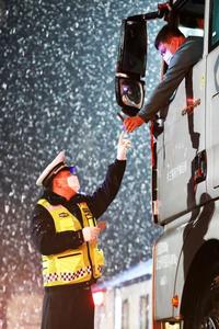 2022年4月29日晚,内蒙古自治区呼伦贝尔市扎兰屯市突降春雪,扎兰屯市公安局交通管理大队的民警坚守在疫情防控执勤卡口,查验来往车辆人员信息,确保过往车辆顺畅通行。