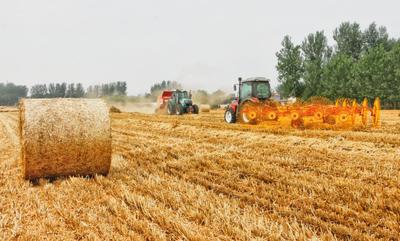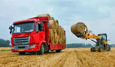 2022年6月4日,在河南省商丘市柘城县浦东街道办事处大张村的一块刚收割完的麦田里,农民忙着把秸秆打捆装车。麦收以来,当地加大秸秆禁烧宣传,重点推广秸秆打捆,用于养殖饲料、电厂发电等,增加农民收入,实现环境效益和经济效益双赢。