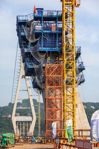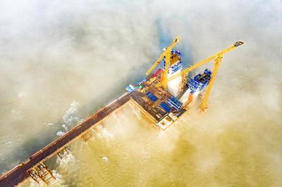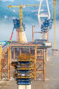 2022年6月14日,四川省泸州市合江县的榕山长江大桥项目建设现场,工人们正在大桥2号主墩及承台上施工作业。