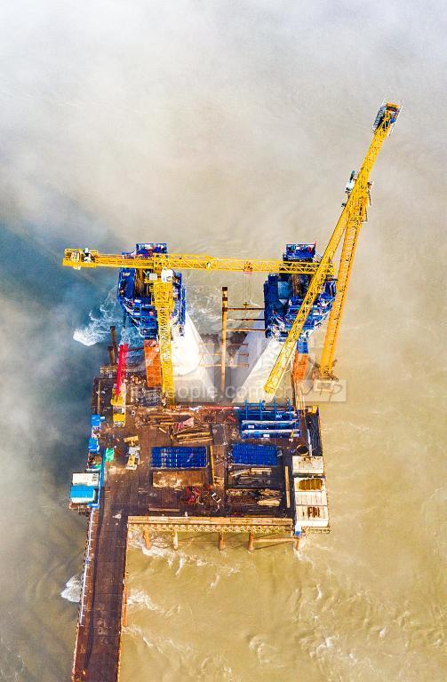 2022年6月14日,四川省泸州市合江县的榕山长江大桥项目建设现场,工人们正在大桥2号主墩及承台上施工作业。 泸州市榕山长江大桥南岸位于泸州市合江县榕山临港工业园区,北岸将与宜泸渝高速公路白米互通立交连接。