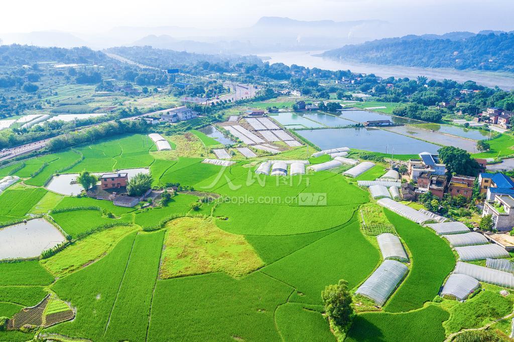 2022年6月14日,用无人机从高空俯瞰四川省泸州市合江县临港街道符阳村,绿茵茵的稻渔共育示范片里,水稻长势喜人,生机盎然。 近年来,该县通过打造水稻高产示范片,推动了巴蜀鱼米之乡建设,水稻播种面积达到52万亩,目前已处于孕穗阶段,各种粮大户和群众正积极加强夏季时节田间管理,确保今年又是一个丰收年。