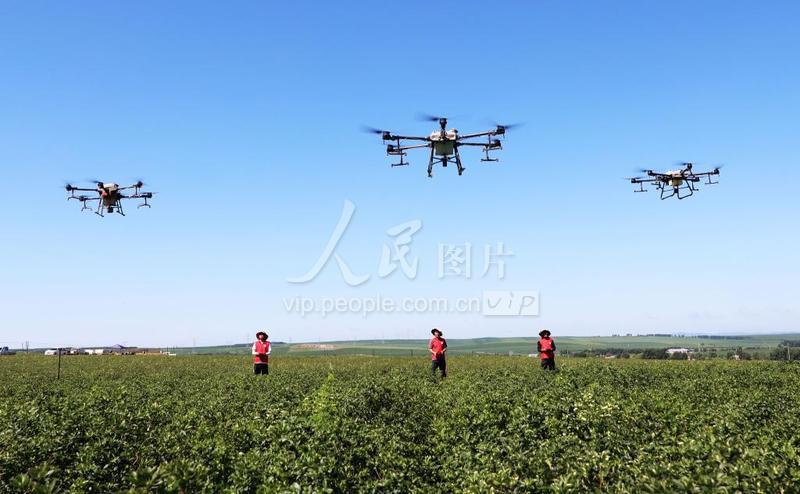 2022年7月7日,无人机手驾驶植保无人机在内蒙古自治区扎兰屯市成吉思汗镇天原中草药种植农民合作社苍术田间喷洒叶面肥。 今年,内蒙古自治区呼伦贝尔市扎兰屯市成吉思汗镇繁荣村天原中草药种植农民专业合作社在原有播种机、收割机等现代农机具基础上,引进植保无人机进行中草药管护施肥作业,成为高效精准地执行农业生产的新农具,助力乡村振兴。