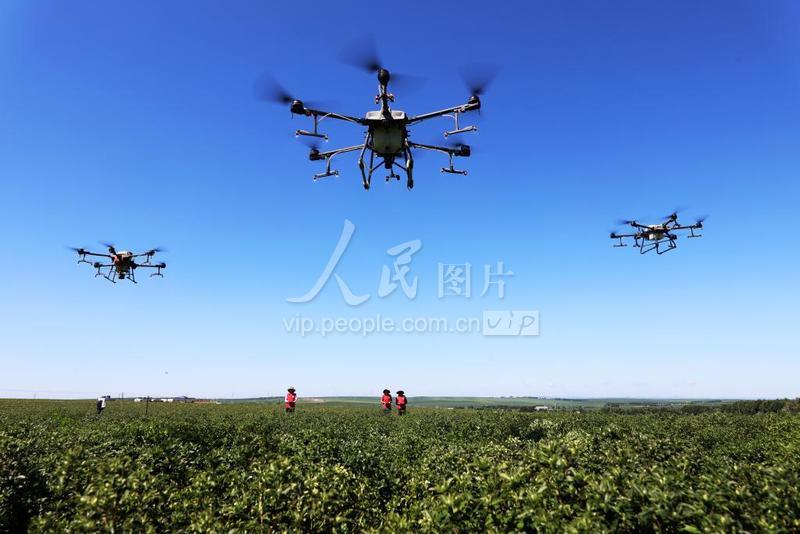 2022年7月7日,无人机手驾驶植保无人机在内蒙古自治区扎兰屯市成吉思汗镇天原中草药种植农民合作社苍术田间喷洒叶面肥。