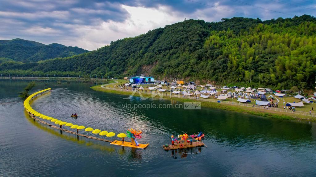 2022年7月30日,安徽宁国青龙乡西津河上,一条由20张竹筏组成的190米金色“巨龙”在西津河中游弋而过,与秀美山水构成一幅河上金龙图。