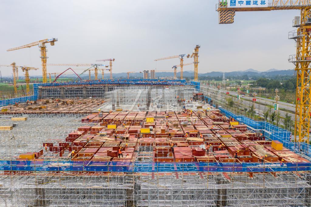 2022年10月11日,在四川彭山经济开发区计划总投资100亿元的中创新航动力电池及储能系统眉山基地项目建设现场,塔吊林立,工人们正在抢抓厂房建设。