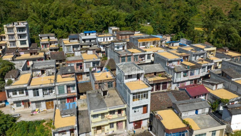2022年10月21日,在广西壮族自治区靖西市地州镇鲁利村,村民将收割回来的稻谷拉到自家平房楼顶、庭院晾晒。