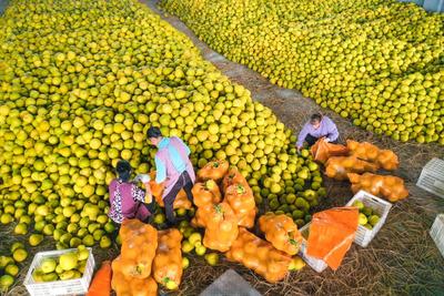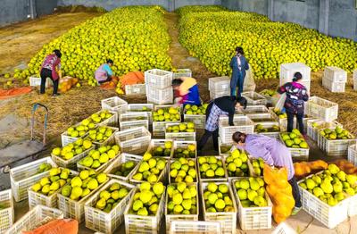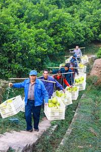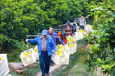 2022年11月21日,四川省泸州市合江县望龙镇四合山村的村民们在真龙柚基地里忙着采摘、摘果、转运、装箱真龙柚,及时投放市场。