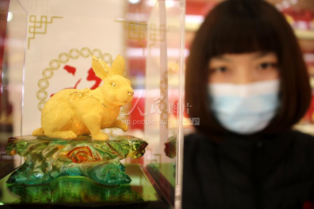 2022年12月11日,江苏苏州,距离农历兔年还有一段时间,款式各异的“金兔”摆件已经纷纷摆上金店的柜台,受到人们的青睐。