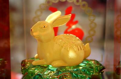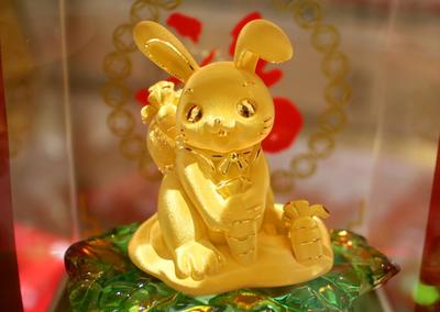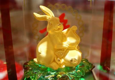 2022年12月11日,江苏苏州,距离农历兔年还有一段时间,款式各异的“金兔”摆件已经纷纷摆上金店的柜台,受到人们的青睐。