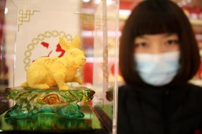 2022年12月11日,在江苏省苏州市龙凤金店,顾客在购买“金兔”摆件。