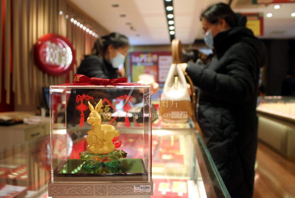 2022年12月11日,在江苏省苏州市龙凤金店,顾客在购买“金兔”摆件。