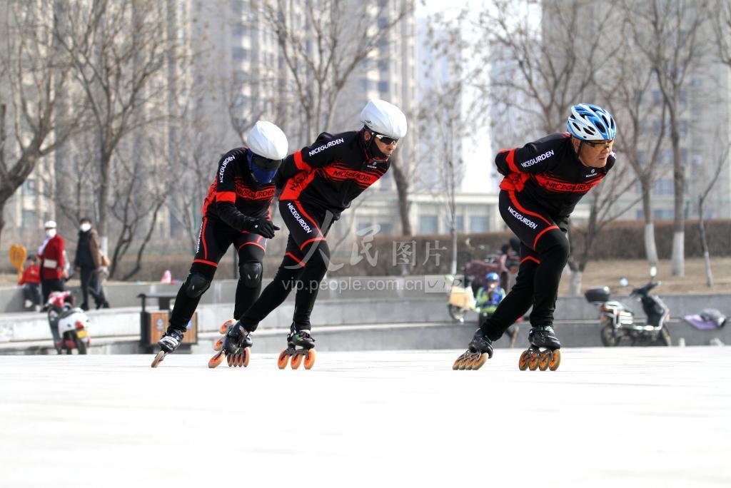 2023年3月9日,辽宁沈阳,在丁香湖公园广场,一群中老年轮滑爱好者在玩轮滑锻炼身体,享受健身快乐。