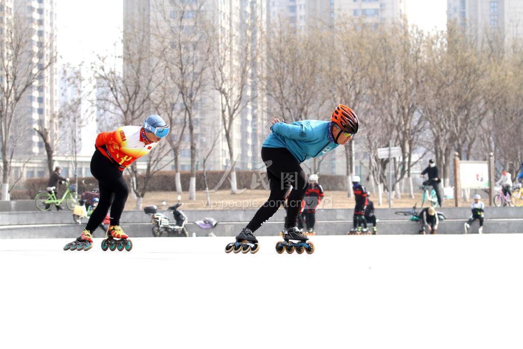2023年3月9日,辽宁沈阳,在丁香湖公园广场,一群中老年轮滑爱好者在玩轮滑锻炼身体,享受健身快乐。