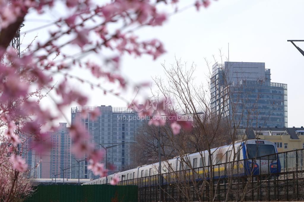 2023年3月9日,北京地铁13号线列车从海淀区新建成的京张铁路遗址公园内盛开的山桃花海边穿越,这趟开往春天的列车,成为京城一道靓丽的风景线,吸引市民前来打卡拍照。